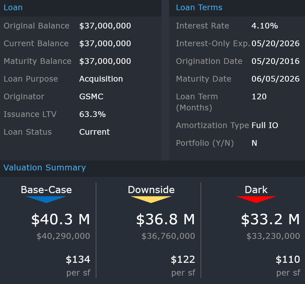 Community Health Systems (CHS), a healthcare operator and provider based in Tennessee, is the largest tenant at Cool Springs Commons, accounting for 66% of the GLA with a 199,915-sf lease that expired in January 2021. Cool Springs Commons is a Class-B office property located in suburban Nashville. Commentary from the servicer stated that CHS has already relocated many of its employees, which indicates downsizing by the tenant at best. A second tenant, Comprehensive Health Management, has a 17,789-sf lease that expires on November 30, 2011. CRED iQ’s estimated occupancy for the property is 31%, assuming that CHS completely vacates instead of downsizing. For the full valuation report and loan-level details, click here.