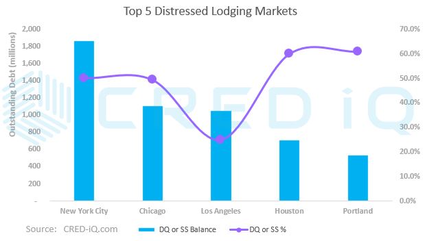 CRED iQ WAR Report – Weekly Asset Review, August 26, 2021 – A snapshot of 5 markets with the highest amount of distressed lodging inventory by outstanding loan balance.