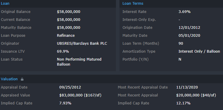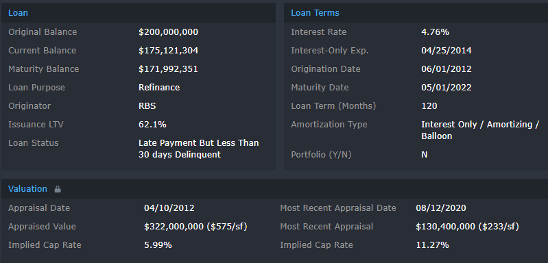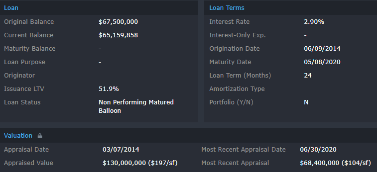 Updated servicer commentary stated the property was 82% occupied. The last full-year financials for the property indicated a DSCR of 2.16 for 2019, which is a prime example of the acceleration of credit deterioration brought on by the pandemic in the form of tenant departures, rent collection issues, and reduced foot traffic. JLL has been put in place to manage the property until the mall can be put to market for a liquidation sale. For the full valuation report and loan-level details, click here.