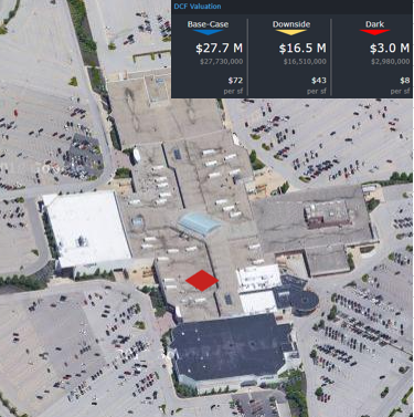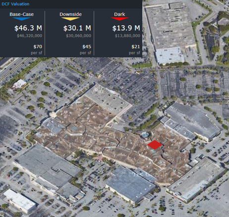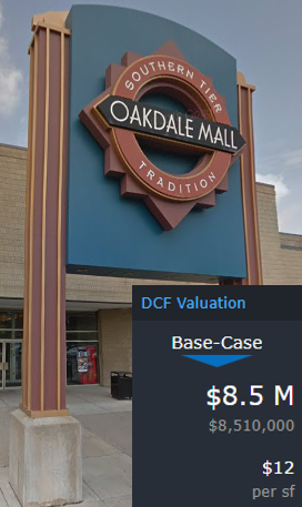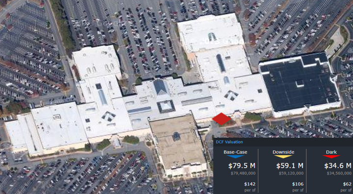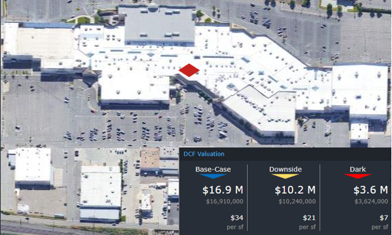 This week, CRED iQ calculated real-time valuations for 5 regional malls that have had title transfers in the past year and are now REO. The updated valuations serve as a follow-up to our August 18 blog – CRED iQ in the News – Regional Mall Distress. The featured assets are the 5 largest malls, by outstanding debt, that have become REO since the onset of the pandemic. One of the featured properties, Oakdale Mall, reportedly has secured a buyer with major redevelopment plants. Check out the commentary below for more detail! CRED iQ valuations factor in a base-case (Most Likely), a downside (significant loss of tenants), and dark scenarios (100% vacant). For full access to the valuation reports as well as full CMBS loan reporting, including detailed financials, updated tenant information, and borrower contact information, sign up for a free trial here.