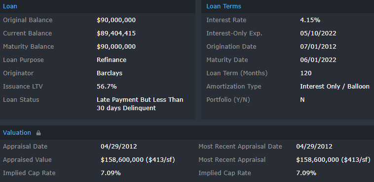 This property, which has outstanding debt of $172.5 million, has been with the special servicer since June 2020. Title to the property transferred to KeyBank, as special servicer, from Simon Property Group in January 2021 via foreclosure. KeyBank appears to still be in the process of assessing the timeline for liquidation, although March 2022 was provided as an estimated resolution date.