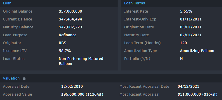 Prior to the mall’s foreclosure, it was encumbered by floating-rate mortgage debt as well as $41.0 million in mezzanine debt, which equated to a 91% LTV based on cumulative debt at origination. Prospective buyers will likely be concerned with lease rollover risk at the property as leases for the three-largest tenants, accounting for 28% of the GLA, are scheduled to expire in 2022. For the full valuation report and loan-level details, click here.