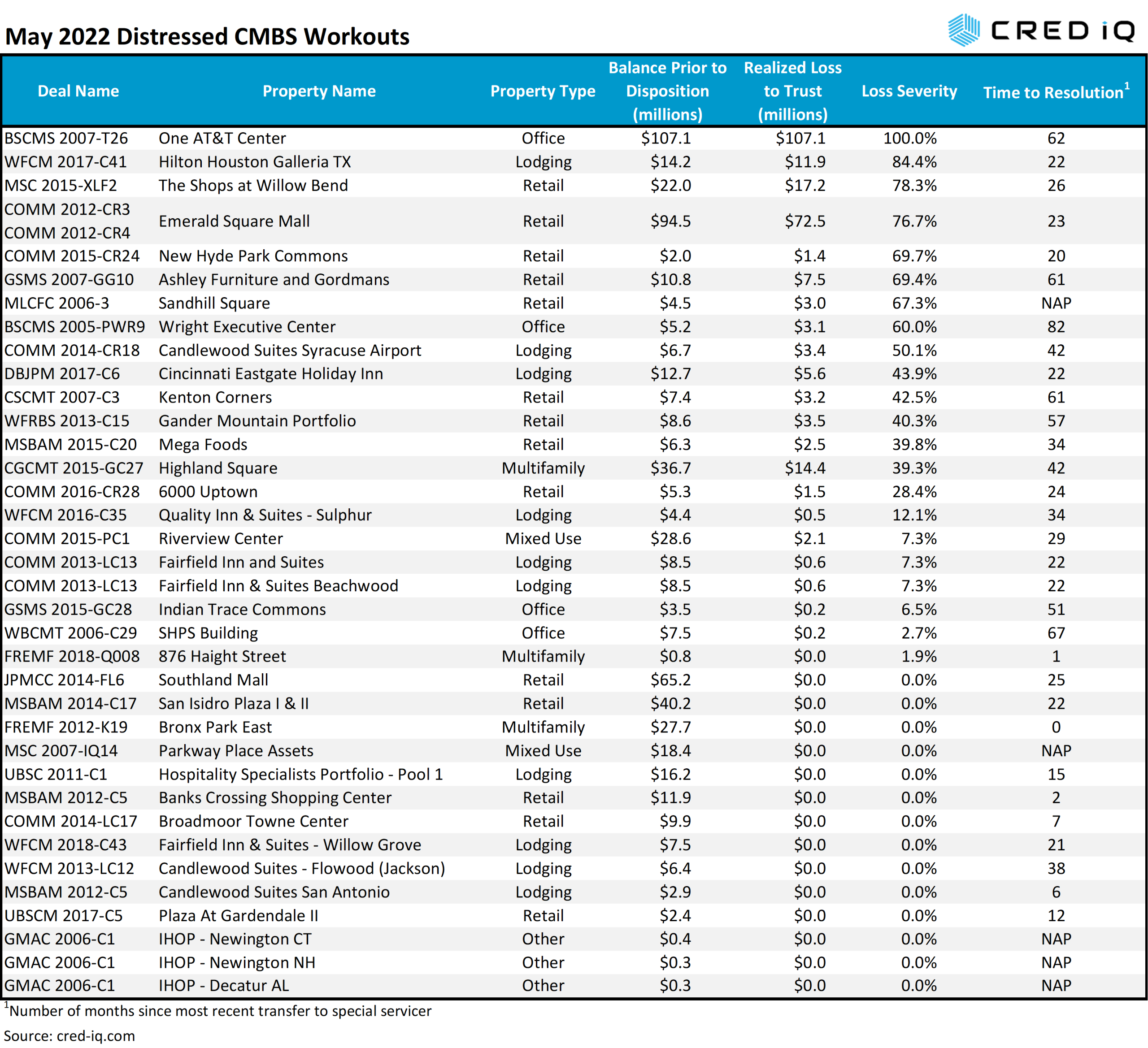One AT&T Center represents the largest loss, by total amount and severity, among all distressed workouts this month. The property was foreclosed on in 2017 after its sole tenant, AT&T, vacated at lease expiration. The 1.2 million-sf office tower sold for $4.1 million, equal to $3/sf, in May 2022 after spending approximately five years in special servicing. The REO asset was liquidated with a 100% loss severity on $107.1 million in outstanding debt prior to disposition.