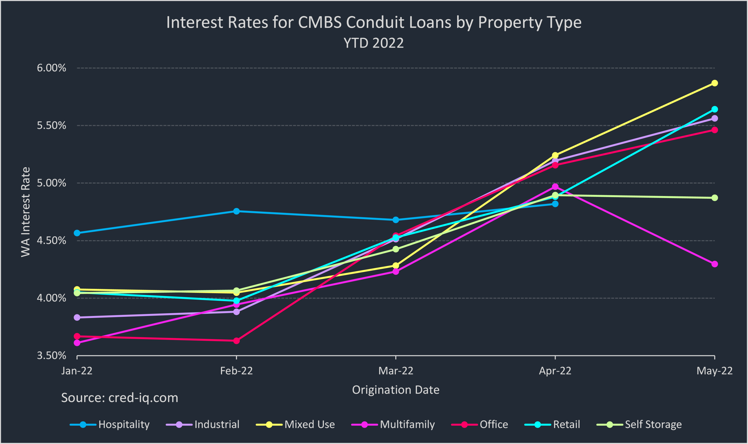 Interest rates for loans secured by office properties exhibited the sharpest increase so far in 2022. The WA interest rate for office loans increased approximately 49%, from 3.67% in January 2022 to 5.46% in May 2022. Office collateral, and especially Class-B and Class-C office, has been a growing concern for originators and investors alike due to weakening fundamentals and uncertainty relating to the overall economy as well as changing dynamics in the workforce. Although rates are rising across all property types, the additional headwinds facing the office sector have likely contributed to sharper increases in interest rates for mortgages secured by office properties.