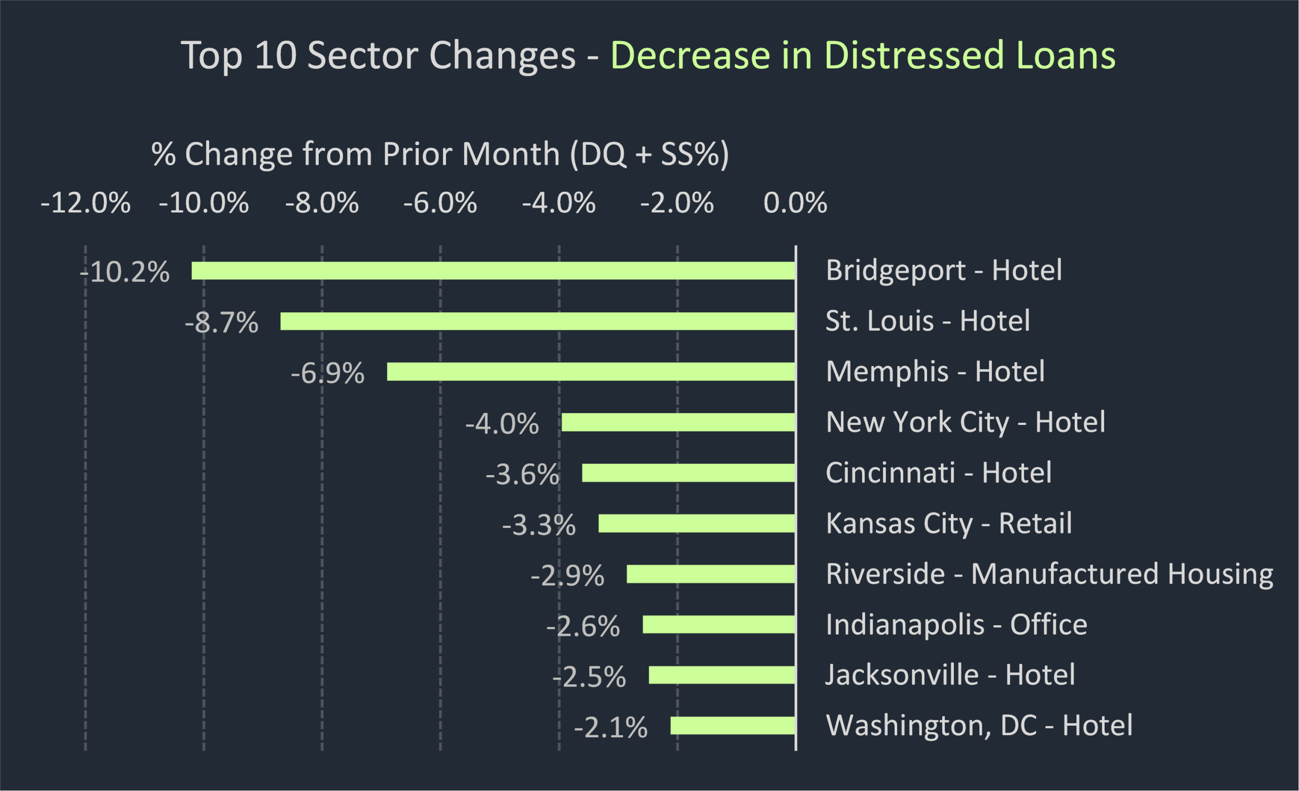 Taking a more granular analysis of the Top 50 markets, CRED iQ further delineated individual market distressed rates by property type for a market-sector view. Much of the improvement in distress across markets can be attributed to the lodging sector. The lodging property type was associated with seven of the 10 sharpest percentage declines in distressed rates across market-sectors during September 2022. There were numerous examples of loans that were rehabilitated and returned to master servicers this month after being with special servicers. Among them included the $23.6 million Embassy Suites St. Louis loan, which positively impacted the St. Louis lodging market (-8.7%), the $12.1 million HGI Memphis Wolfchase Galleria loan, which improved the Memphis hotel market (-6.9%), and the $72.6 million Holiday Inn – 6th Avenue loan, which helped lower distress in the New York City lodging market (-4.0%).