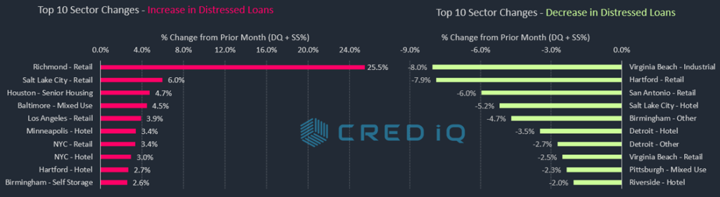 The retail property type was associated with four of the 10 sharpest percentage increases in distressed rates across market-sectors during October 2022. In addition to Richmond, retail markets for Salt Lake City (+6.0%), Los Angeles (+3.9%), and New York City (3.4%) had percentage increases in distressed rates this month.