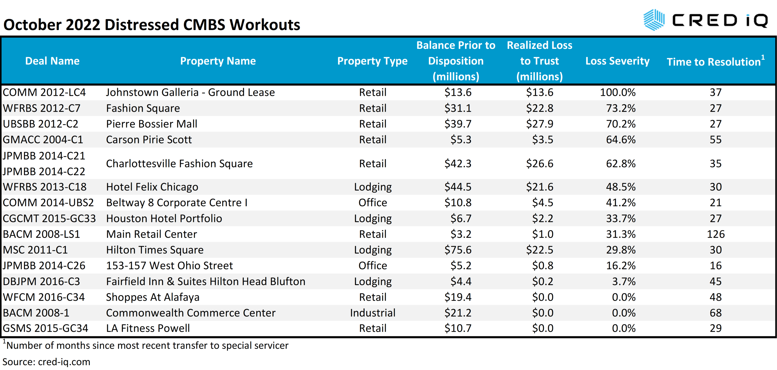 CMBS conduit transactions incurred approximately $147 million in realized losses during October 2022 via the workout of distressed assets. CRED iQ identified 15 workouts classified as dispositions, liquidations, or discounted payoffs in October 2022. Of the 15 workouts, only two of the assets were resolved without a loss. Of the 13 workouts resulting in losses, severities for the month of September ranged from less than 1% to 100%, based on outstanding balances at disposition. Aggregate realized losses in October 2022 were more than twice the total of losses in September despite the same number of workouts. On a monthly basis, realized losses for CMBS conduit and SBLL transactions averaged approximately $138.5 million year-to-date.