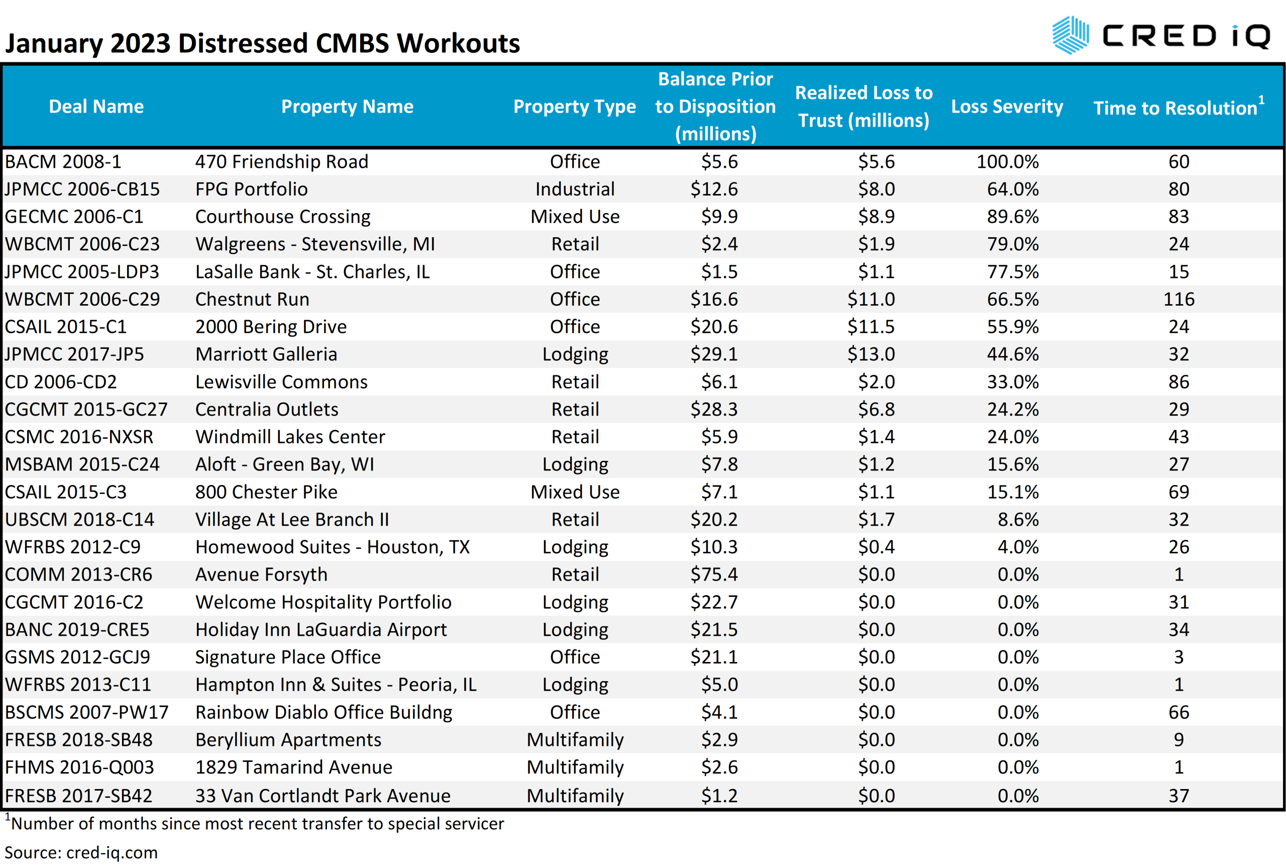 Excluding defeased loans, there was approximately $5.7 billion in securitized debt among CMBS conduit, Single-Borrower Large-Loan, and Freddie Mac securitizations that was paid off or liquidated in January 2023, which was approximately an 18% decrease compared to $7 billion in December 2022. In January, 7% of the loan resolutions were categorized as dispositions, liquidations, or discounted payoffs. The percentage of distressed workouts was only 2% in the prior month. Approximately 28% of the loans were paid off with prepayment penalties, which was less than 36% as of the prior month.