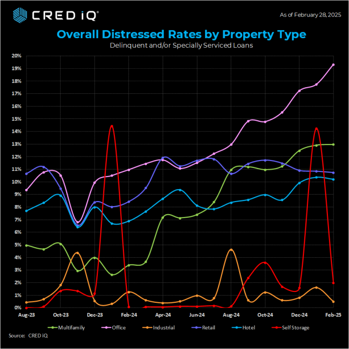 The CRED iQ overall distress rate fell by 70 basis points to 10.8%, breaking a streak of four record highs through last month’s print. CRED iQ’s other distress metrics also notched month-over-month reductions. The CRED iQ delinquency rate fell from from 8.9% in the January print to 8.0%. The CRED iQ special serving rate shaved 20 points this month and now stands at 10.1%. One year ago, delinquency and special servicing rates were 5.4% and 7.0% respectively.