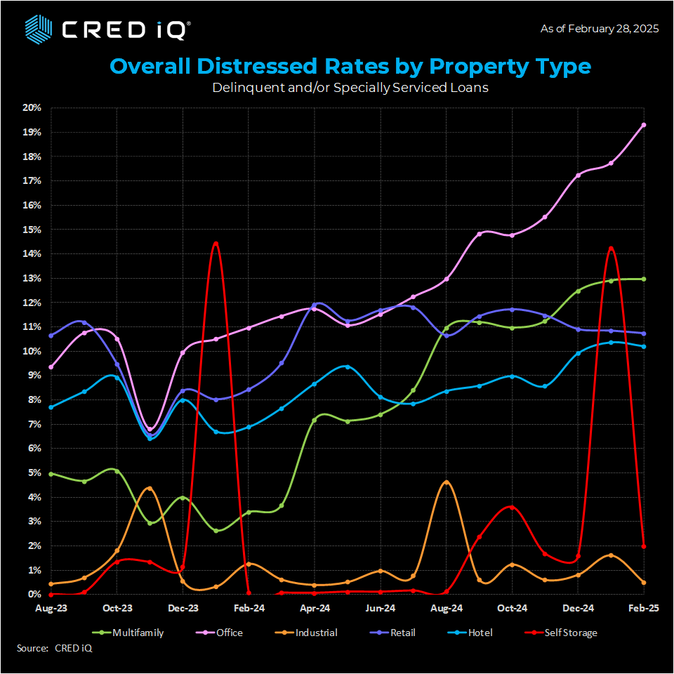 The multi-family segment’s overall distress rate continued to climb modestly in January (up 40 BP) and February added 10 basis points to 13.0%. Multifamily has earned a distant second place in the distressed property type rankings
