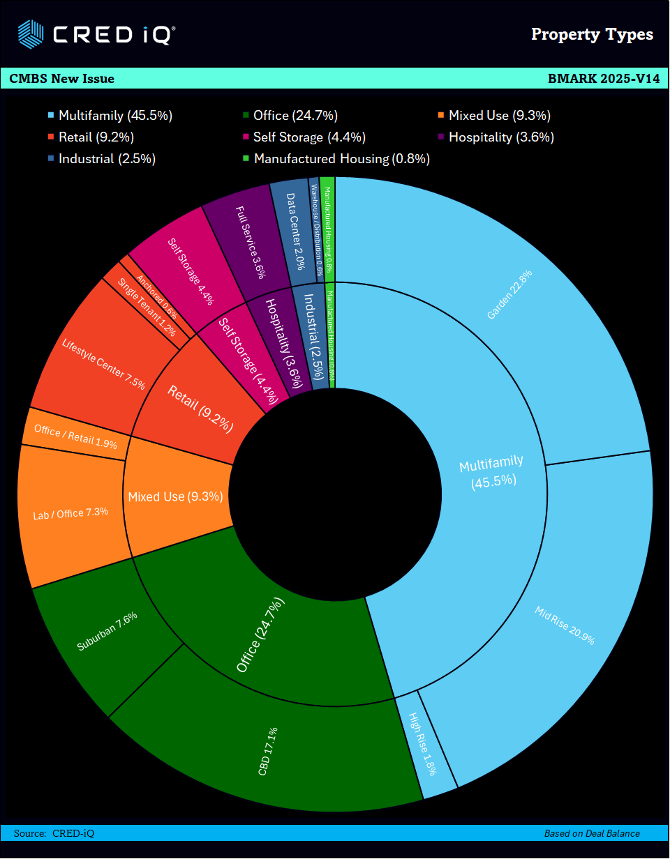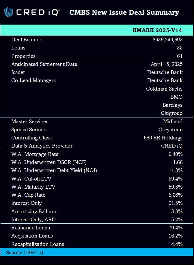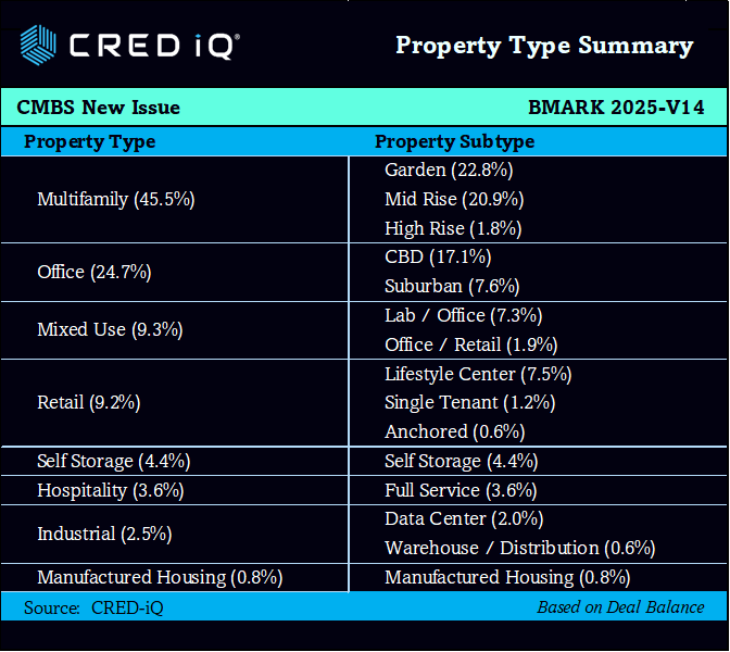 The BMARK 2025-V14 CMBS deal is a new issuance securitization for the CMBS market, with a total pooled balance of $939.2 million. The deal is jointly managed by prominent financial institutions including Deutsche Bank, Goldman Sachs, BMO, Barclays, and Citigroup. The deal is collateralized by 35 loans and secured by 61 properties across a variety of sectors, including multifamily, office, and mixed use. The strategic geographic distribution of these properties ensures balanced exposure across major markets. The deal’s weighted average loan-to-value (LTV) ratio of 59.4%, and the weighted average mortgage interest rate is 6.40%.