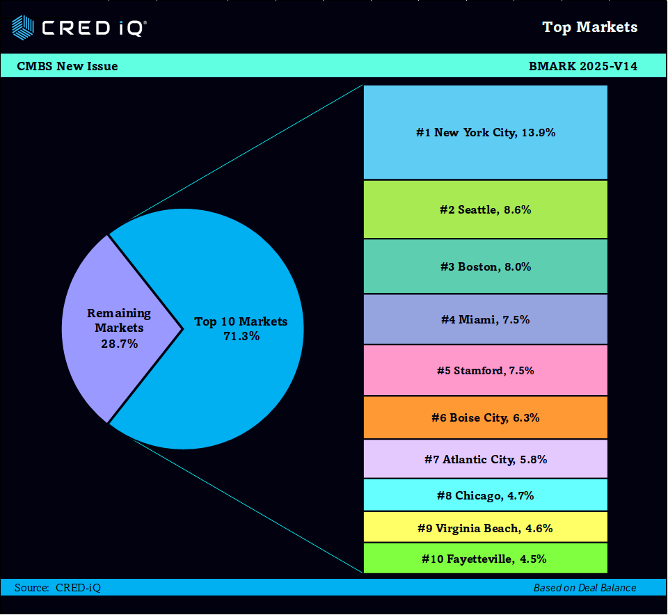 A key strength of the BMARK 2025-V14 CMBS deal is its diverse property type distribution, which enhances portfolio resilience. Multifamily properties constitute 45.5% of the total balance, while retail offices account for 24.7% of the balance. The geographic distribution of the properties across prime markets, including high-growth areas in New York City, Seattle, and Boston.