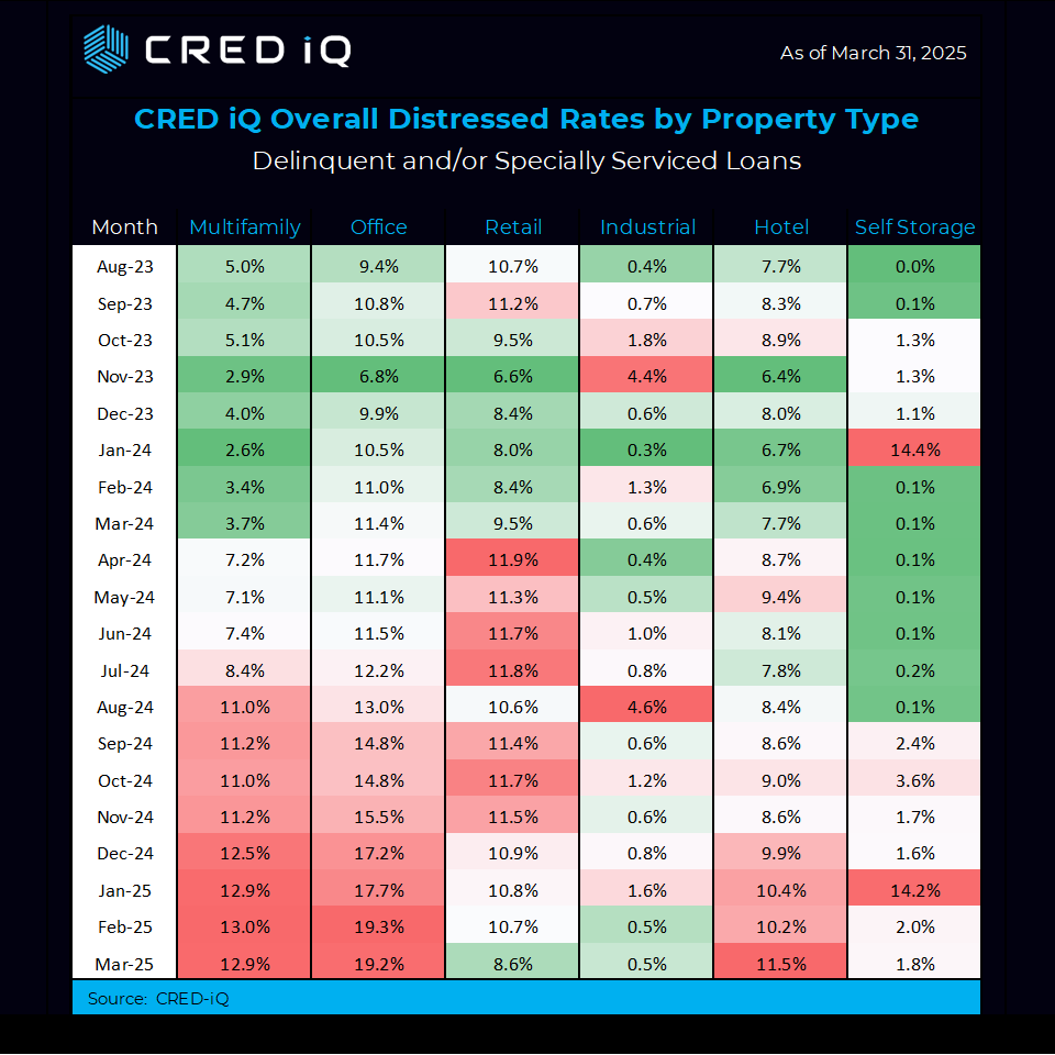 Among property types, the office and multifamily segments remain the most distressed, though both posted relatively flat results. Office continues to lead the pack at 19.2% (down 10 basis points from March), while multifamily eased slightly to 12.9% (also down 10 basis points). These incremental declines hint at resilience, but the broader distress levels in these sectors still warrant close attention.