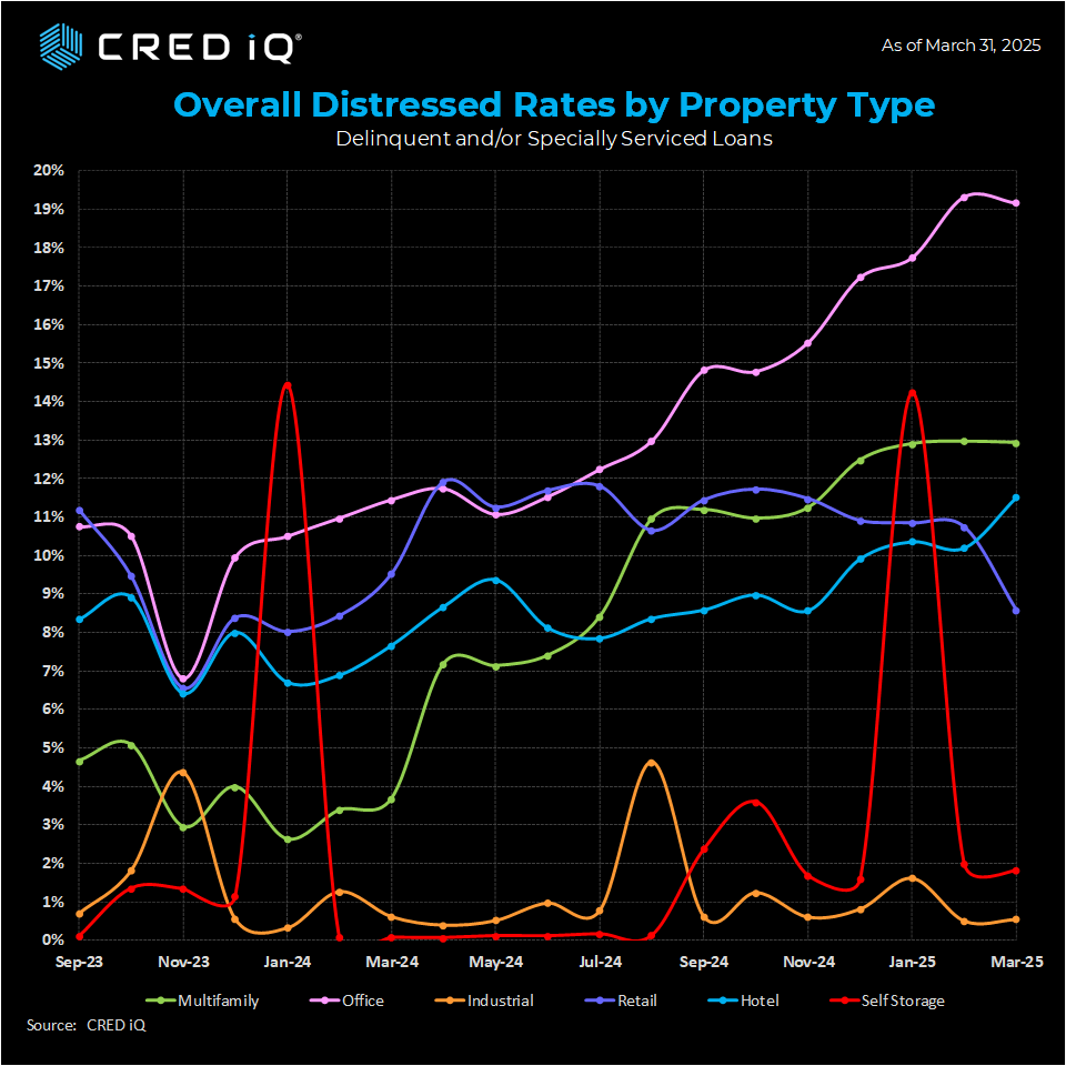 Industrial and self-storage, as expected, remain bright spots. Industrial held steady at an impressively low 0.5% distress rate, while self-storage shaved 20 basis points to 1.8%. These segments continue to demonstrate stability amid broader market fluctuations.