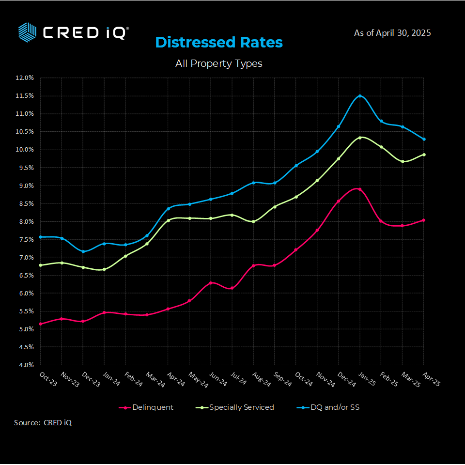 CRED iQ’s distress rate, a composite metric capturing loans 30+ days delinquent (or worse) and those in special servicing, fell by 30 basis points to 10.3% in the latest reporting period. This marks the third straight month of declines, signaling potential relief in the CRE sector after a period of heightened volatility. Despite this positive trend, the delinquency rate ticked up slightly from 7.9% to 8.0%, while the special servicing rate increased by 20 basis points to 9.9%. These upticks highlight the need for vigilance as underlying pressures persist.