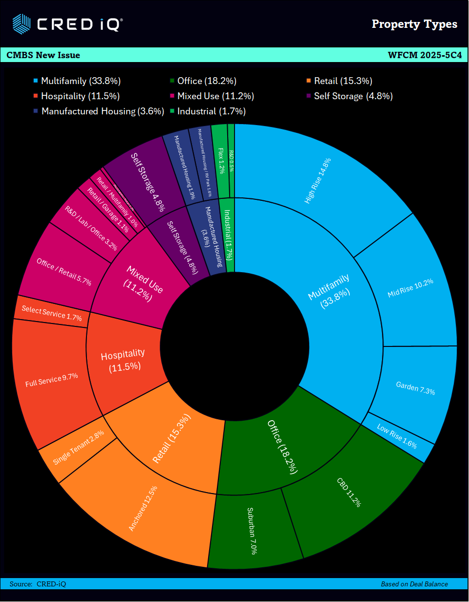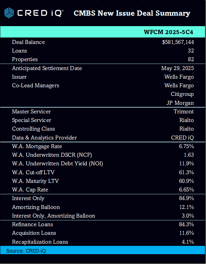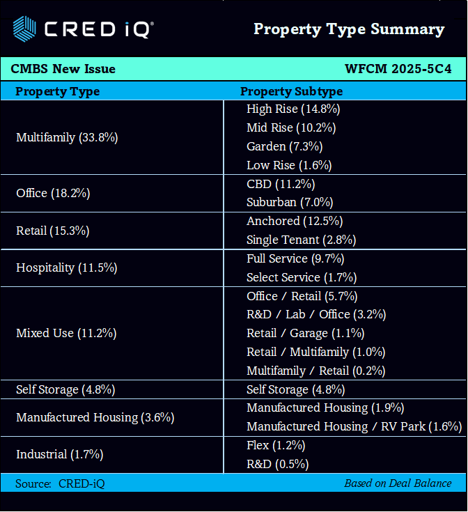 The WFCM 2025-5C4 CMBS deal is a new issuance securitization for the CMBS market, with a total pooled balance of $581.6 million. The deal is jointly managed by prominent financial institutions including Wells Fargo, Citigroup, and JP Morgan. The deal is collateralized by 32 loans and secured by 82 properties across a variety of sectors, including multifamily, office, and retail. The strategic geographic distribution of these properties ensures balanced exposure across major markets. The deal’s weighted average loan-to-value (LTV) ratio of 61.3%, and the weighted average mortgage interest rate is 6.75%.