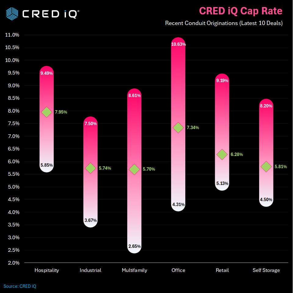 CRED iQ analyzed underwriting metrics for the latest 10 transactions that have been packaged into CMBS securitizations. Our analysis examined cap rates, interest rates, and debt yields.  We further broke down these statistics by property type and then compared our results to CRED iQ’s previous report issued in February.