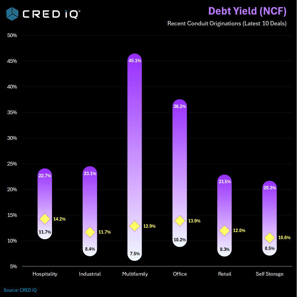 Debt yield trends for offices ranged from 10.2% to 36.2% with an average of 13.9%, which is up from 13.0% in February.  Average debt yields for multifamily loans in CMBS deals ranged from 7.5% to 45.1% with an average of 12.9%, which is up 340 basis points from an average of 9.50% in the prior quarter.  Retail debt yields ranged from 8.3% to 21.5% with an average of 12.0%, which is up from an average of 11.6% in mid-Q1.