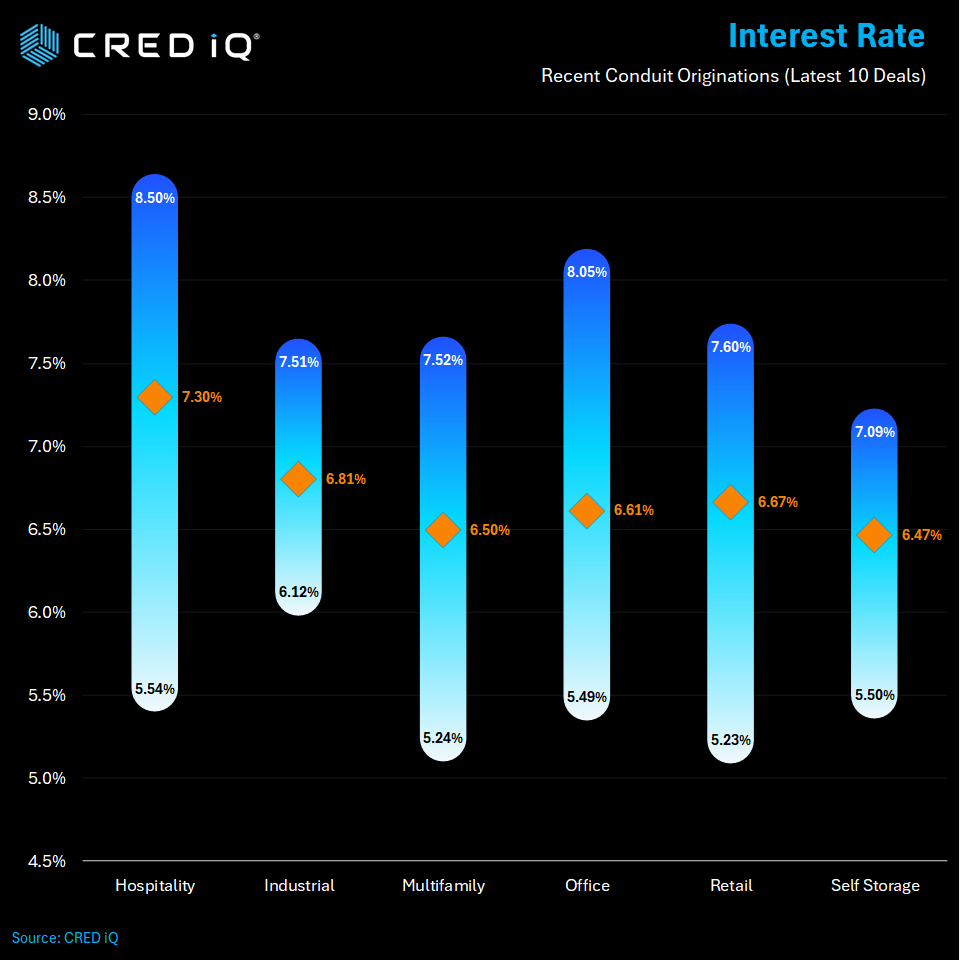 Office interest rates ranged from 5.49% to 8.05 % with an average of 6.61%, which is down 5 BPS from 6.66% in Q3 2024.  Interest rates for multifamily loans in CMBS deals ranged from 5.24% to 7.52% with an average of 6.50%, which is also down 8 basis points from 6.58%. Retail interest rates ranged from 5.23% to 7.60% with an average of 6.67%, which is up from an average of 6.51% in the February print.