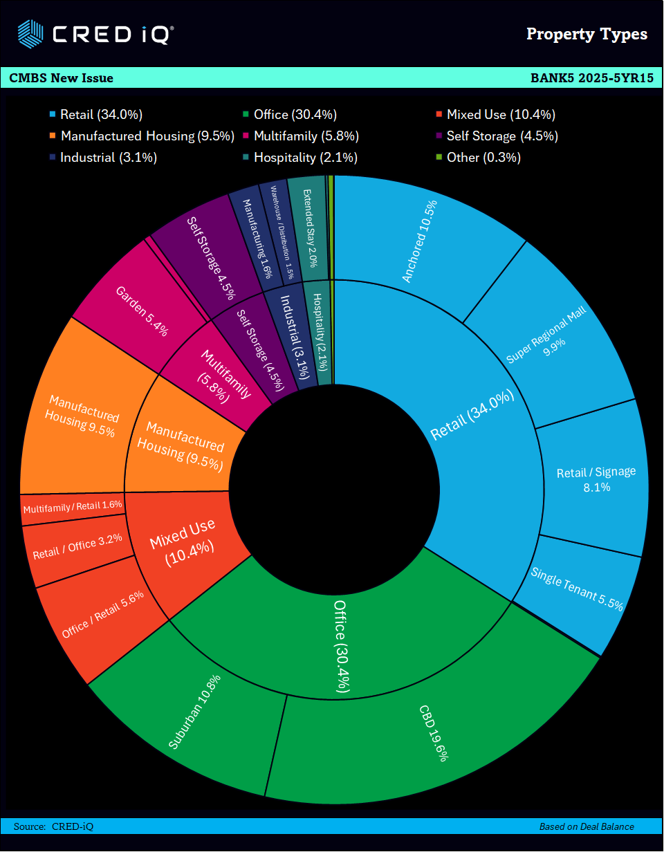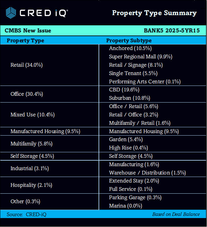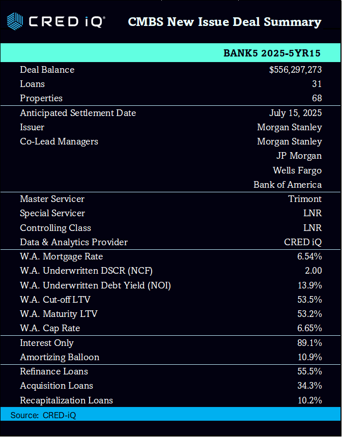 The BANK5 2025-5YR15 CMBS deal is a new issuance securitization for the CMBS market, with a total pooled balance of $556.3 million. The deal is jointly managed by prominent financial institutions including Morgan Stanley, JP Morgan, Wells Fargo, and Bank of America. The deal is collateralized by 31 loans and secured by 68 properties across a variety of sectors, including retail, office, and mixed use. The strategic geographic distribution of these properties ensures balanced exposure across major markets. The deal’s weighted average loan-to-value (LTV) ratio of 53.5%, and the weighted average mortgage interest rate is 6.54%.