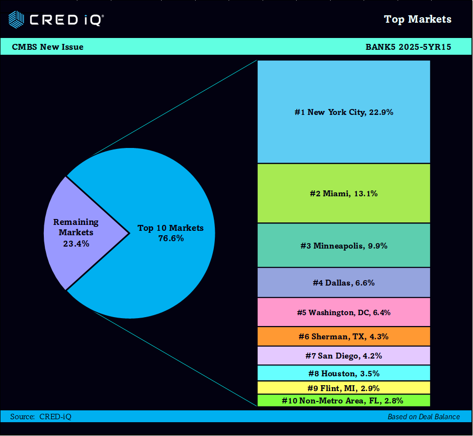 A key strength of the BANK5 2025-5YR15 CMBS deal is its diverse property type distribution, which enhances portfolio resilience. Retail properties constitute 34.0% of the total balance, while office properties account for 30.4% of the balance. The geographic distribution of the properties across prime markets, including high-growth areas in New York City, Miami, and Minneapolis.