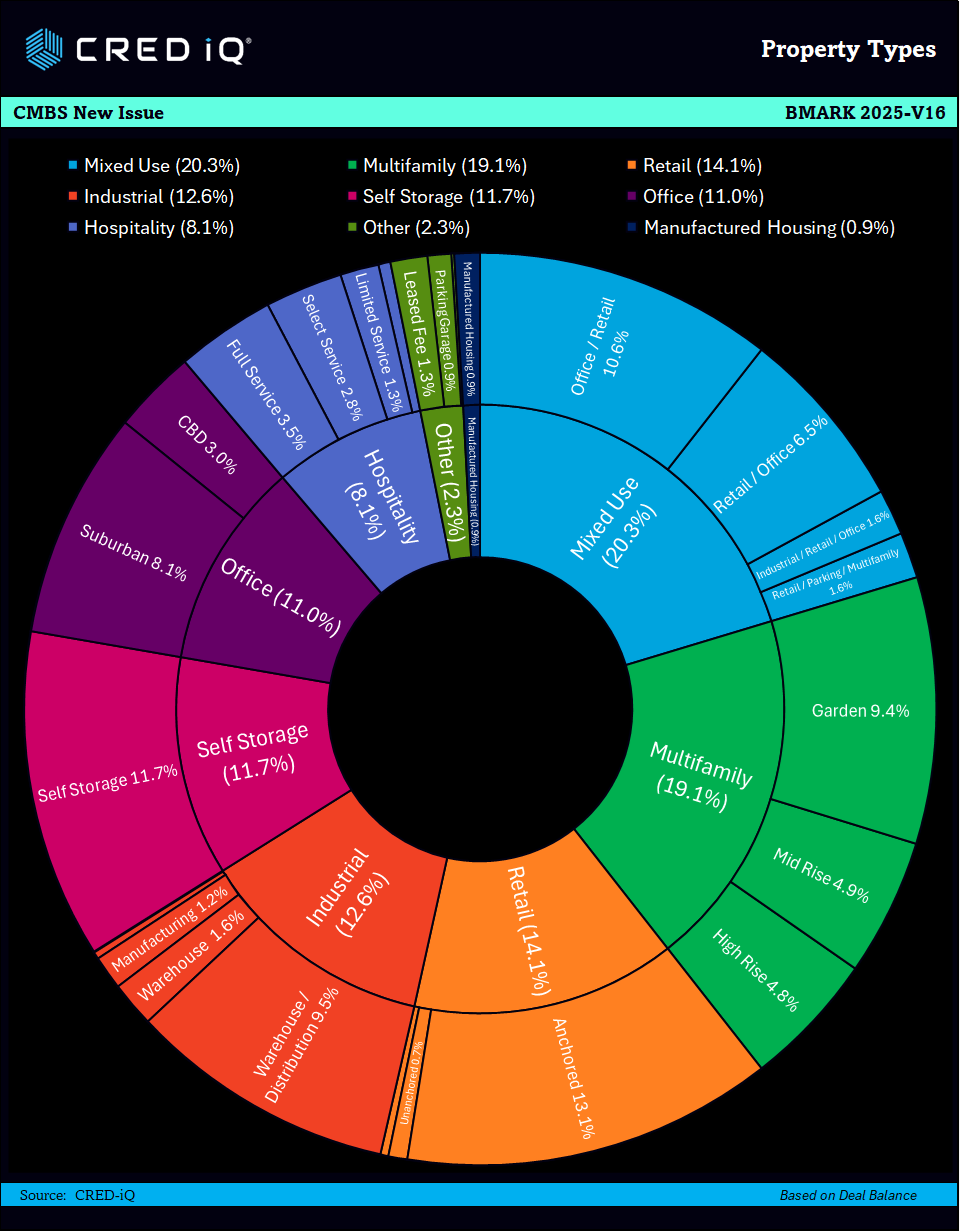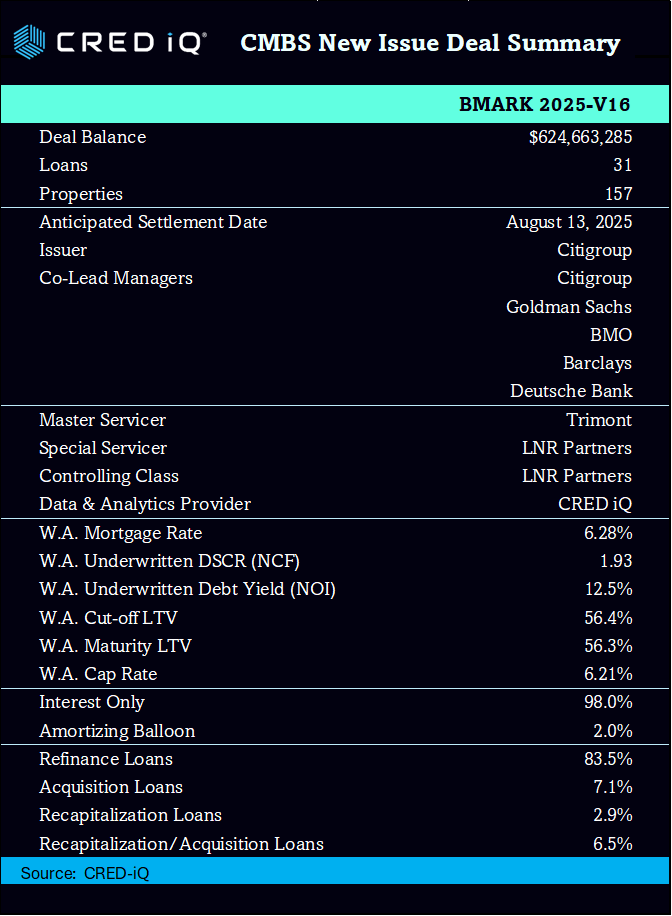 The BMARK 2025-V16 CMBS deal is a new issuance securitization for the CMBS market, with a total pooled balance of $624.7 million. The deal is jointly managed by prominent financial institutions including Citigroup, Goldman Sachs, BMO, Barclays, and Deutsche Bank. The deal is collateralized by 31 loans and secured by 157 properties across a variety of sectors, including mixed use, multifamily, and retail. The strategic geographic distribution of these properties ensures balanced exposure across major markets. The deal’s weighted average loan-to-value (LTV) ratio of 56.4%, and the weighted average mortgage interest rate is 6.28%.