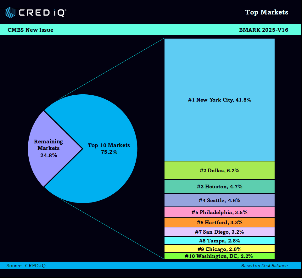 A key strength of the BMARK 2025-V16 CMBS deal is its diverse property type distribution, which enhances portfolio resilience. Mixed Use properties constitute 20.3% of the total balance, while multifamily properties account for 19.1% of the balance. The geographic distribution of the properties across prime markets, including high-growth areas in New York City, Dallas, and Houston.