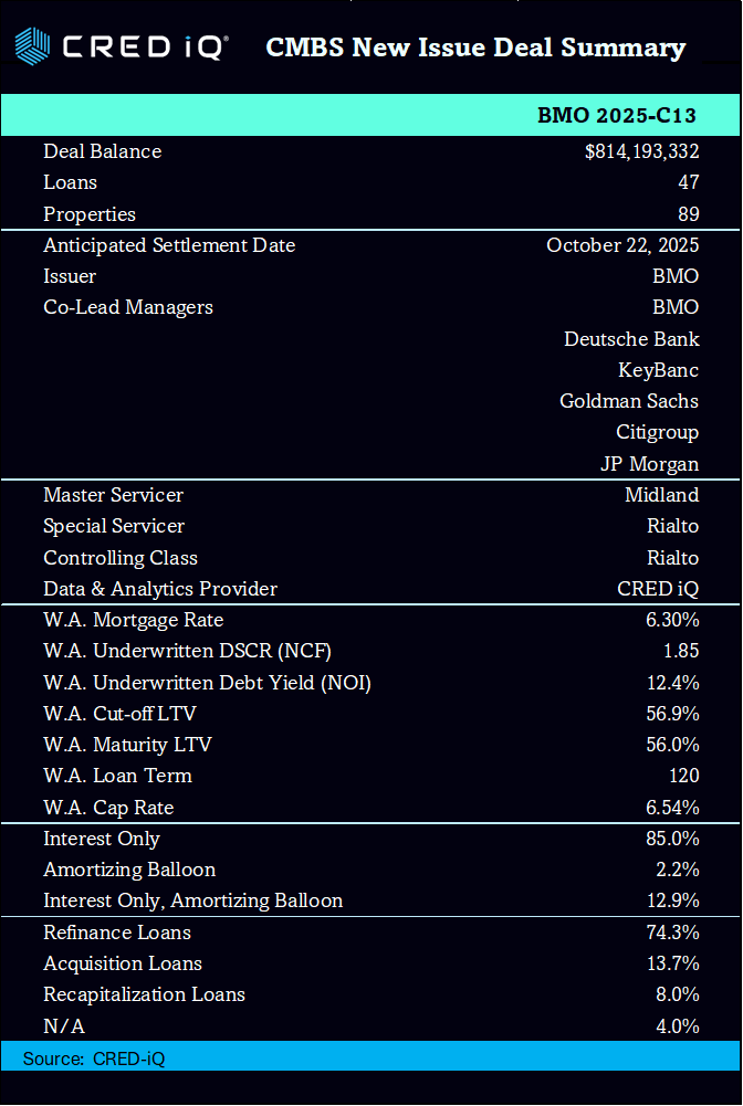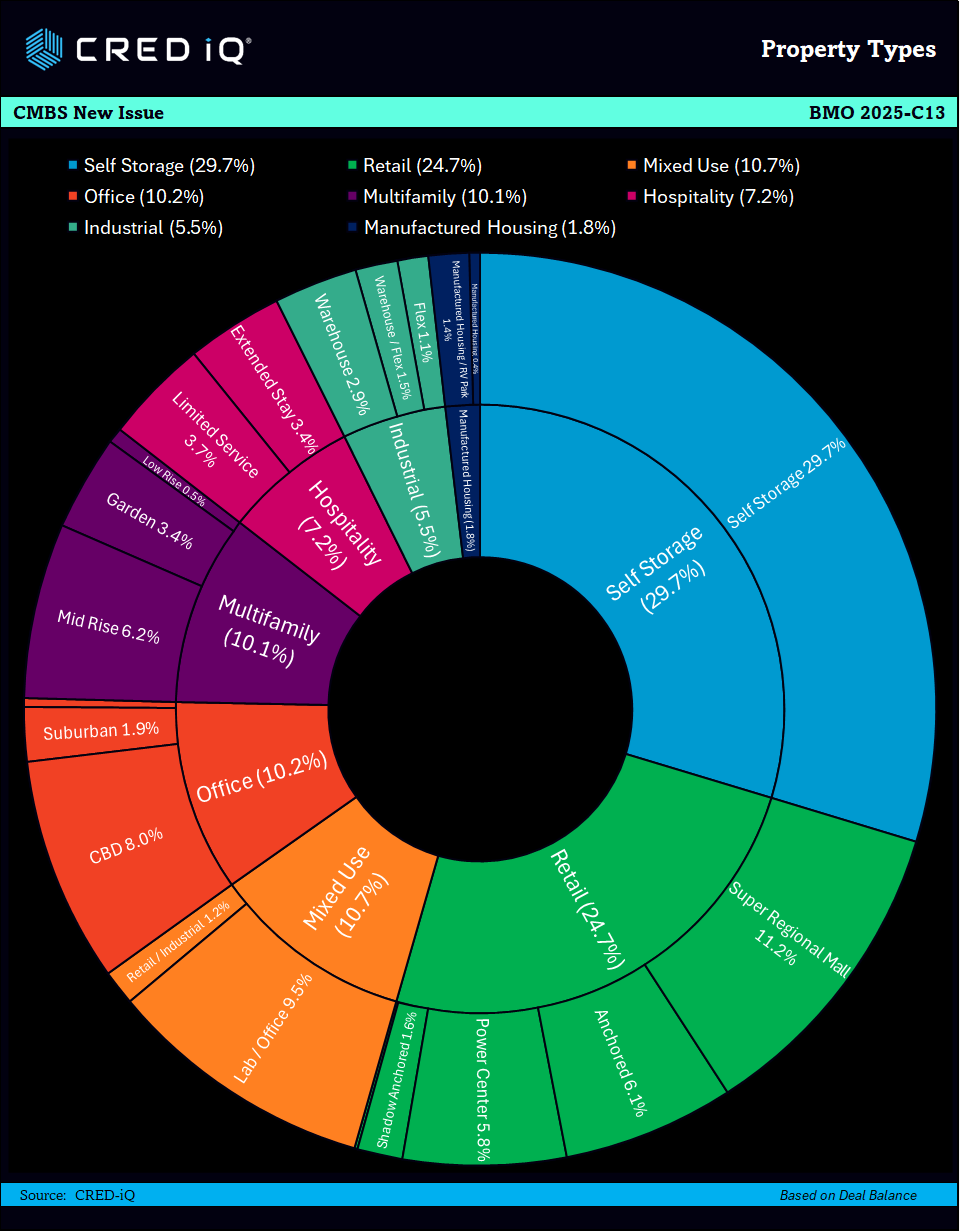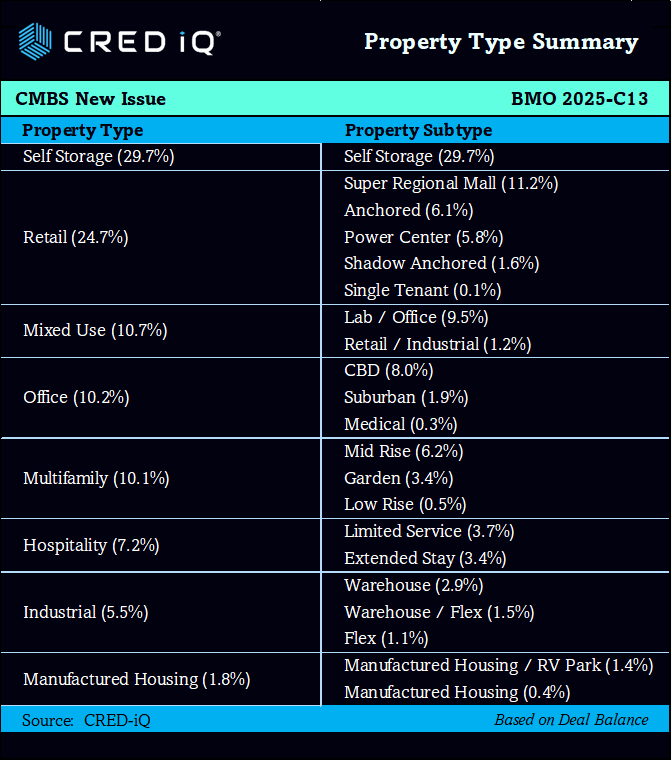 The BMO 2025-C13 CMBS deal is a new issuance securitization for the CMBS market, with a total pooled balance of $814.2 million. The deal is jointly managed by prominent financial institutions including BMO, Deutsche Bank, KeyBanc, Goldman Sachs, Citigroup, and JP Morgan. The deal is collateralized by 47 loans and secured by 89 properties across a variety of sectors, including self storage, retail, and office. The strategic geographic distribution of these properties ensures balanced exposure across major markets. The deal’s weighted average loan-to-value (LTV) ratio of 56.9%, and the weighted average mortgage interest rate is 6.30%.