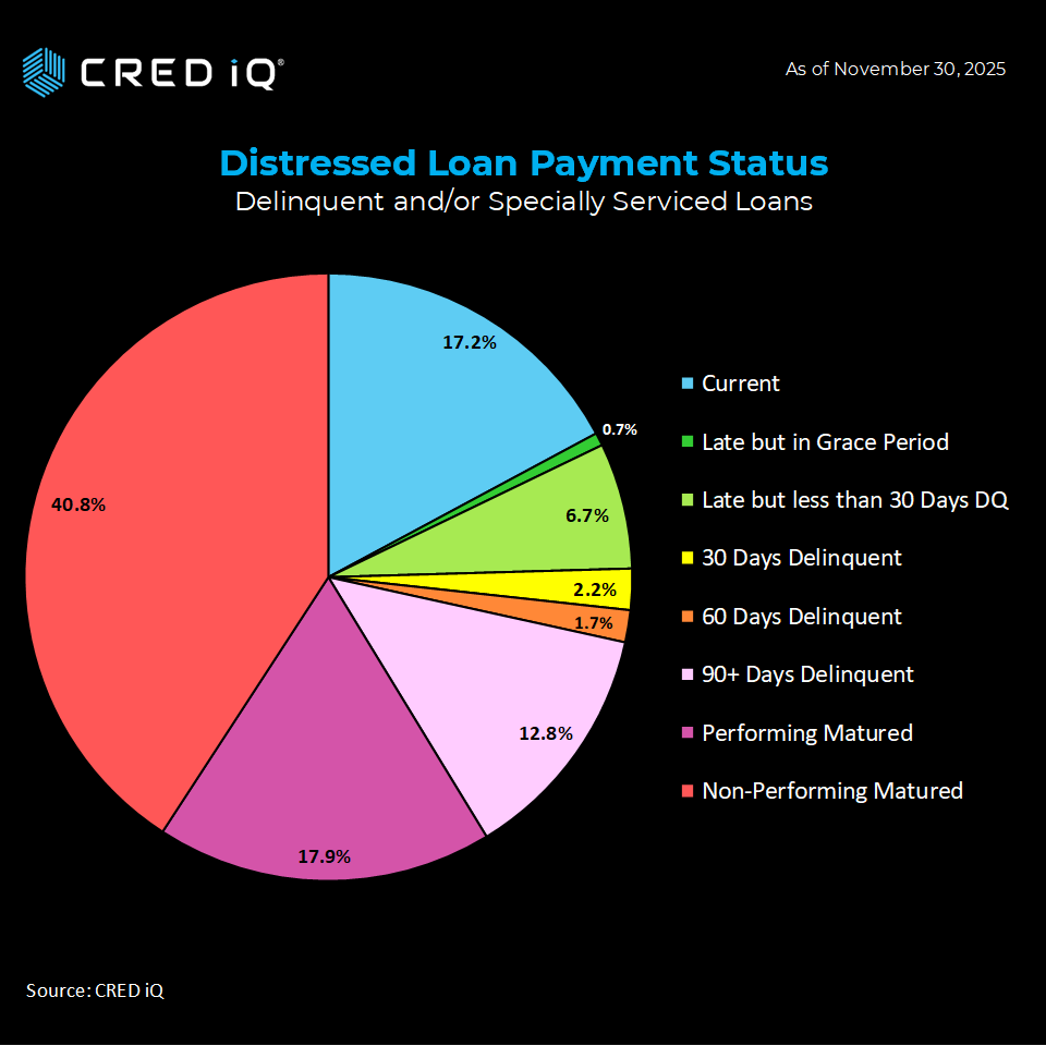 For CRE investors and CMBS bondholders, the November data reinforces the need for careful credit monitoring, particularly in the Office and Multifamily heavy portfolios. With nearly 60% of distressed loans tied to maturity defaults, the market’s ability to clear this backlog will depend heavily on interest rate movements and the willingness of special servicers to extend or modify terms in the coming quarters.