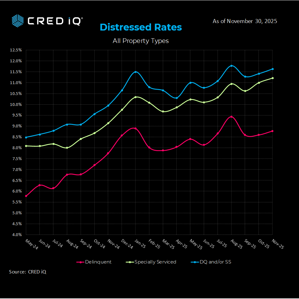 The commercial real estate (CRE) sector continues to face headwinds as the latest data from CRED iQ reveals a rise in distress metrics for November 2025. The CRED iQ Overall Distress Rate reached 11.63%, marking an increase from the previous month. This uptick underscores the persistent volatility in the market, driven largely by maturity defaults and sector-specific weakness.