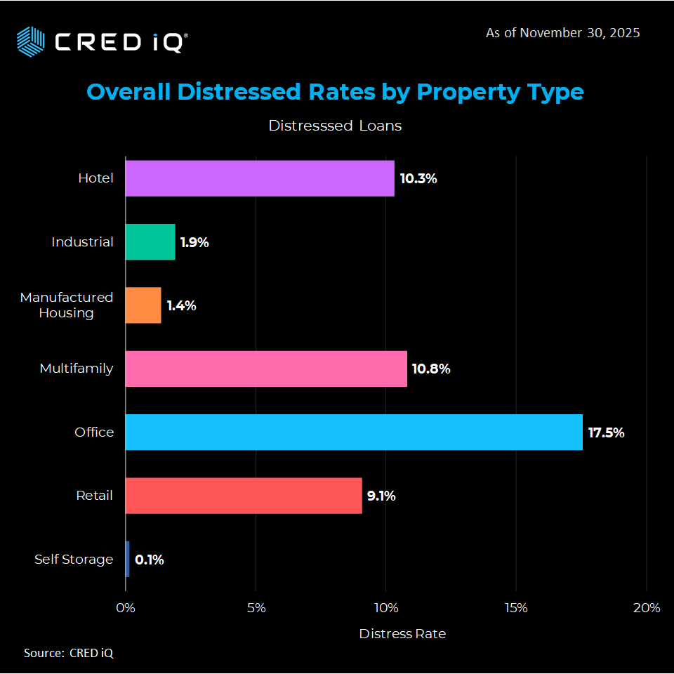 Following Office, the Multifamily sector posted a distress rate of 10.80%, reflecting struggles with floating-rate debt and operating expense inflation. The Hotel sector also remains in double-digit distress territory at 10.33%, while Retail sits slightly lower at 9.08%. Conversely, niche asset classes continue to outperform; Industrial and Self Storage remain the most resilient sectors, with distress rates of just 1.90% and 0.15%, respectively.