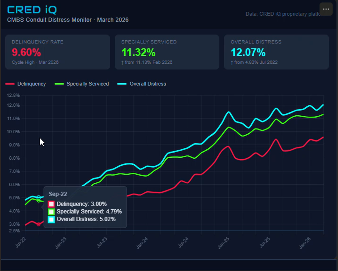 As of March 2026, 9.60% of CMBS conduit loan balances tracked by CRED iQ are delinquent — loans that are 30+ days past due, in foreclosure, REO, or matured with a balloon payment outstanding. That figure has more than tripled from 2.93% in July 2022, when the current distress cycle effectively began with the Federal Reserve’s aggressive rate hiking campaign. The pace of deterioration has not been linear. A brief plateau in mid-2025, when the overall distress rate dipped toward 10.64% last March, offered a window of cautious optimism that proved premature. By December 2025, distress had re-accelerated to 11.70%, and the March 2026 print of 12.07% has now eclipsed every prior reading in the dataset.