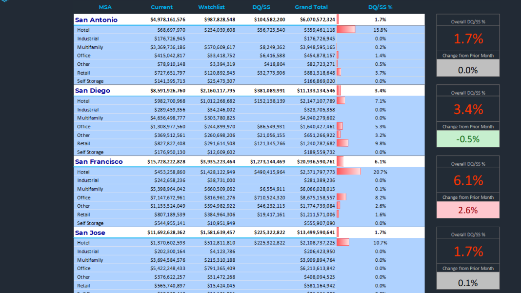 CRED iQ  monitors market performance for nearly 400 MSAs across the United States. Below is a summary of the default rates for the 50 largest metros segmented by property type. Consistent with the months following the start of the pandemic, the hotel and retail sectors remain the largest contributors to the delinquency percentages for the majority of these statistical areas.  Loans backed by self-storage, multifamily, and industrial facilities posted the lowest delinquency rates for most of these markets.