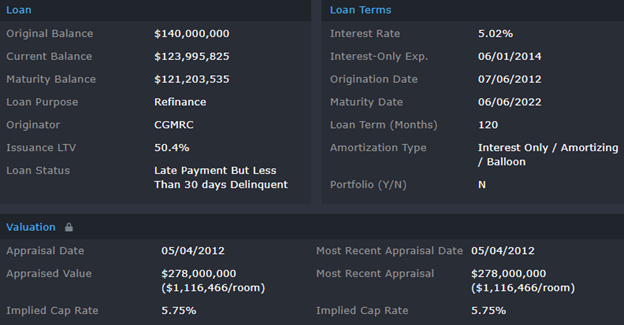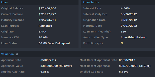 Although COVID-19 was cited a contributing factor for the transfer to special servicing, the property had operational concerns pre-pandemic with a DSCR of 0.52 in 2019 based on $4.7 million in NCF. This represented a 70% decline since origination. The hotel had a net loss of $8.7 million in 2020 and a modification for relief in the form of relaxed cash management and reserve requirements was previously granted in May 2020. Negotiations between the borrower and LNR, as special servicer, are ongoing. For the full valuation report and loan-level details, click here.