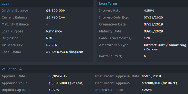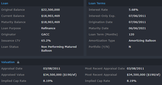 This $6.4 million loan transferred to special servicing on June 14, 2021 due to delinquency. The loan is secured by 41,328 sf of in-line retail space that is shadow-anchored by a Hobby Lobby. Occupancy declined to 84% in early 2021 when the property’s fourth-largest tenant, FitRev Gym, relocated to a nearby Walmart-anchored shopping center. Prior to the transfer to special servicing, the Borrower had cited pandemic-related hardships as a reason for the property being distressed. Complicating matters, the property’s largest tenant, Tuesday Morning, has a lease expiration in January 2022. For the full valuation report and loan-level details, click here.
