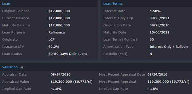 This $22.9 million loan transferred to special servicing on June 8, 2021 due to payment default. The loan is secured by four retail buildings, including a single-tenant Walgreens outparcel, located on the South Side of Chicago. All four buildings were formerly shadow-anchored by Target, but the retailer closed the adjacent non-collateral location in 2018. Without a complementary shadow anchor, occupancy across the 3 buildings with in-line suites declined. News broke in March 2021 that Discover would convert the former Target into a credit card call center; however, the development may not produce the necessary foot traffic needed for the property’s retail tenants to achieve sales targets. For the full valuation report and loan-level details, click here.