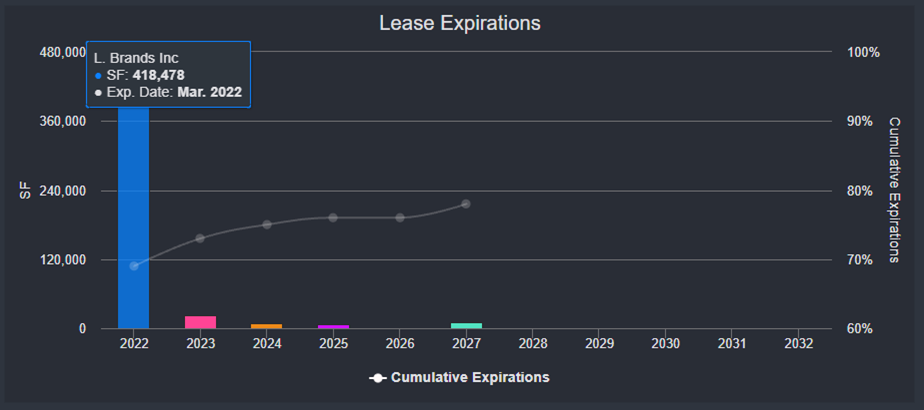 L Brands is vacating approximately 418,000 sf of space upon lease expiration on March 31, 2022 at 1740 Broadway. The property, a 26-story office tower located in the Midtown West submarket of Manhattan, NY, secures a $308.0 million mortgage loan that has been on the servicer’s watchlist since April 2021. News of L Brands’ departure pre-dated the loan’s addition to the servicer’s watchlist, however, when a CBRE Research note first pointed out the fashion retailer’s impending move to 55 Water Street in March 2020. The property’s second largest tenant at origination, law firm Davis & Gilbert, also vacated its 95,000-sf space, equal to 16% of the GLA, at lease expiration in December 2020.