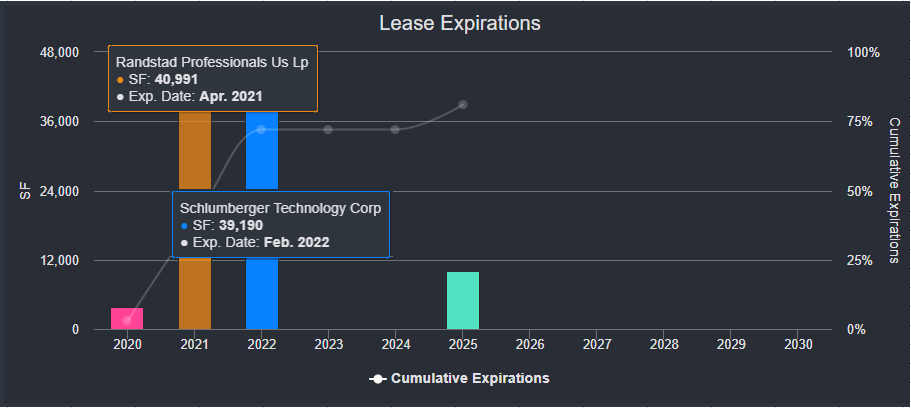 Schlumberger is the property’s second-largest tenant with a 39,190-sf lease, accounting for 33% of the GLA. Schlumberger’s lease expires on February 28, 2022. Commentary from the servicer’s watchlist indicates the tenant may reduce its footprint at lease expiration. A downsizing for full departure would create added distress to a building that was 80% occupied as of April 2021. Approximately 49% of the GLA is being marketed as available for lease. CRED iQ estimates that occupancy could decline to about 12%, accounting for departures of Randstad and Schlumberger. For the full valuation report and loan-level details, click here.