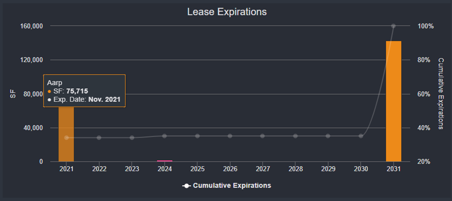 AARP is vacating approximately 76,000 sf of space at lease expiration on November 30, 2021 at the Rockville Corporate Center. The property, a two-building suburban office complex located in Rockville, MD, secures a $32.6 million mortgage loan that is scheduled to mature on May 6, 2022. AARP accounts for approximately 34% of the property’s GLA and was the primary tenant at 15 West Gude Drive. A large vacancy just 5 months prior to maturity could adversely impact the loan’s refinancing prospects. The property’s second building, located at 45 West Gude Drive, is fully leased to Montgomery County Public Schools through December 2031. CRED iQ estimates occupancy of 66% for the office complex following the departure of AARP. For the full valuation report and loan-level details, click here.