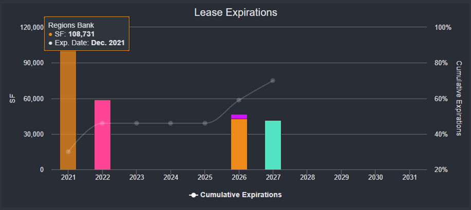 Regions Bank has a 108,731-sf lease expiration on December 31, 2021 at a suburban office complex located about 15 miles outside of Memphis, TN. Regions Bank is the largest tenant at the property and accounts for 30% of the GLA. The property, which consists of three buildings, secures a $25.2 million mortgage loan that has been on the servicer’s watchlist since December 2020. Regions Bank appears to be vacating the property at lease expiration. The space is being marketed as available and Colliers has the listing. Occupancy at the property declined to 72% during 2020 and the loss of Regions Bank would reduce occupancy even further to 42%. With loan maturity less than 4 months away, lease rollover issues at this property will likely need to be resolved before the borrower can secure refinancing. For the full valuation report and loan-level details, click here.