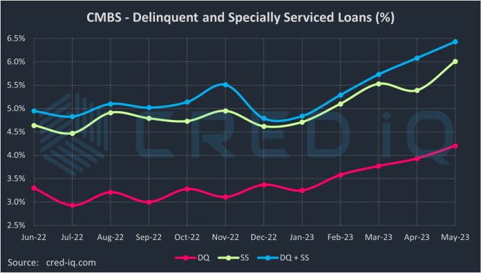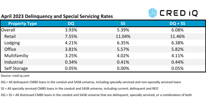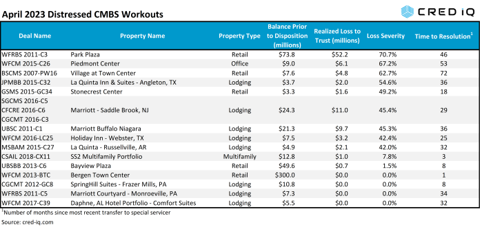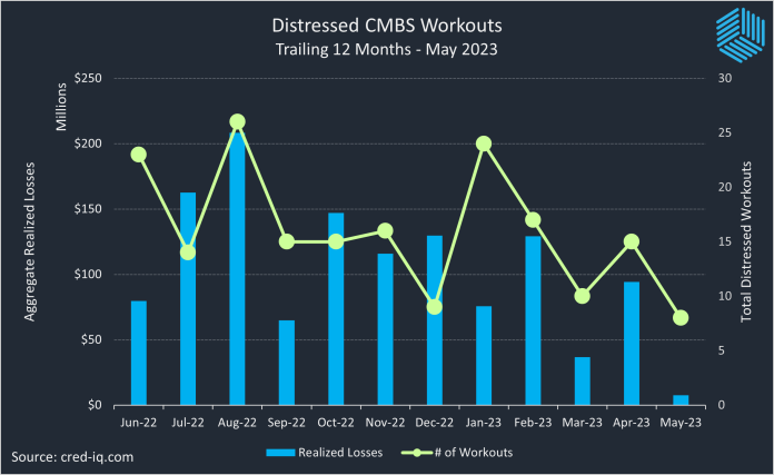 Properties and mortgage notes securing nearly $600 million in outstanding CMBS debt were auctioned from January 2023 through mid-June 2023, based on CRED iQ’s observations of impending losses for investors. Sales through an auction can take a couple months to close; however, sale transactions can be delayed or even fail to close after a due diligence process. Additional complications include relatively tighter lending for the commercial real estate market compared to the prior year; although, many of the distressed auction sales can attract all-cash acquisition bids. Of the approximate 70 auctions observed thus far in the first half of 2023, only nine sales auctioned assets with CMBS debt totaling $40 million were closed as of the June 2023 reporting period.