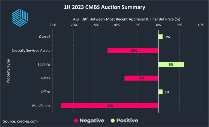 CRED iQ observed insights into pricing discovery for properties that resulted from assets’ final bids. Of the auction results confirmed during the first half of 2023, there were 25 CMBS properties that reported appraisal dates as of 2021 or later. Excluding assets with pre-2021 appraisals, approximately 32% of the auctioned assets were observed to have received final bids that were higher than most recent appraisals.