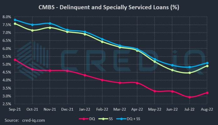 The CRED iQ delinquency rate for CMBS rose higher during the August 2022 reporting period, exhibiting the first month-over-month increase in over two years. This month, the delinquency rate, equal to the percentage of all delinquent specially serviced loans and delinquent non-specially serviced loans, for CRED iQ’s sample universe of $500+ billion in CMBS conduit and single asset single-borrower (SASB) loans was 3.21%, which was 28 bps higher than last month’s delinquency rate of 2.93%. CRED iQ’s special servicing rate, equal to the percentage of CMBS loans that are with the special servicer (delinquent and non-delinquent), increased month-over-month to 4.91% from 4.47%. The special servicing rate increased to its highest level over the past three months. Aggregating the two indicators of distress – delinquency rate and special servicing rate – into an overall distressed rate (DQ + SS%) equals 5.10% of CMBS loans that are specially serviced, delinquent, or a combination of both. The overall distressed rate increased compared to the prior month’s distressed rate of 4.47%. These distressed rates typically track slightly higher than special servicing rates as most delinquent loans are also with the special servicer.