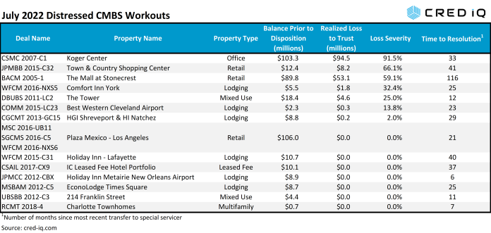 The liquidation of Koger Center represented the largest loss, by dollar amount and loss severity, among all distressed workouts this month. The liquidation alone accounted for 58% of the total realized losses for the month. Koger Center, an 854,944-sf multi-building suburban office campus in Tallahassee, FL, had been in special servicing since October 2019 and was auctioned in May 2022. Outstanding debt for the asset totaled $103.3 million and July’s liquidation resulted in a loss severity of 91.5% based on the balance at disposition.