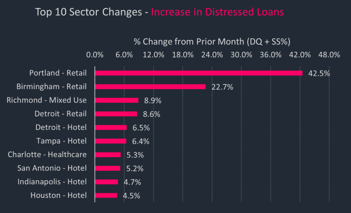 The Minneapolis MSA has the highest overall distressed rate at 21.77%, which was an increase compared to the prior month distressed rate of 20.10%. Birmingham (9.69%), Cleveland (9.56%), Hartford, CT (9.4%), and Milwaukee (9.11%) comprise the remaining markets with the highest rates of distress. Birmingham was a new addition to the Top 5 distressed markets this month stemming from increased retail distress. The Jacksonville market (0.26%) had the lowest percentage of distress among the Top 50 MSAs, supplanting the Sacramento MSA (0.30%) which now has the second-lowest distressed rate.