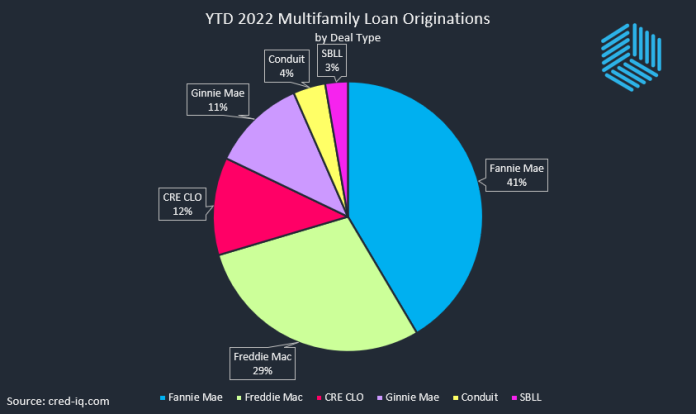Freddie Mac securitizations accounted for 29% of YTD 2022 multifamily originations within the subset. New multifamily originations that were securitized in CRE CLO (12%), Ginnie Mae (11%), Conduit (4%) and Single Asset Single Borrower (3%) transactions made up the remainder.