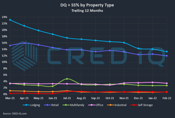 Another sector with notable improvements in February was the Chicago hotel market. The improvement was primary driven by the delinquency cure of the $95.9 million Marriott Chicago River North Hotel and its subsequent return to the master servicer. The loan had been in special servicing since July 2020 due to pandemic-related issues. Despite the improvement, the rate of distress for Chicago hotels is still one of the highest among the Top 50 MSAs, equal to 43.9% this month.